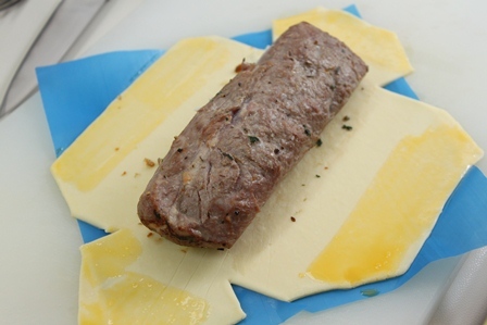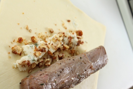 ブルーチーズとクルミを砕いてパイシートにのせてラム肉と一緒に包みます