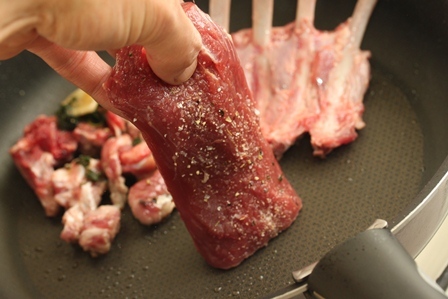 要は、今回のこの羊は繊維がたてに走っているから、塩の浸透も遅いし、肉汁がぬけずらいから、早めに塩を振ってね。