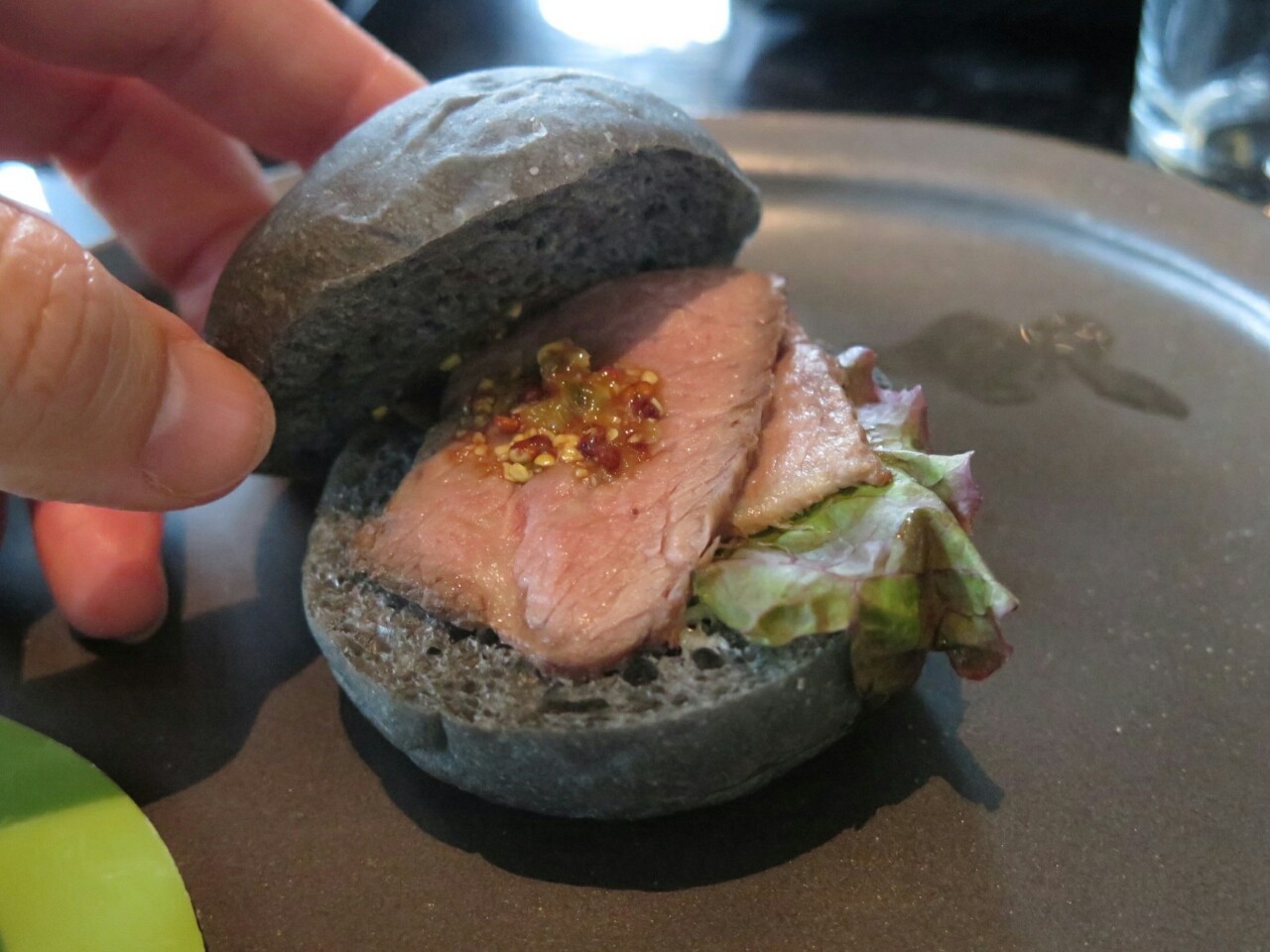 黒い塊は、竹炭を練りこんで焼いたパンのローストビーフのサンドイッチ