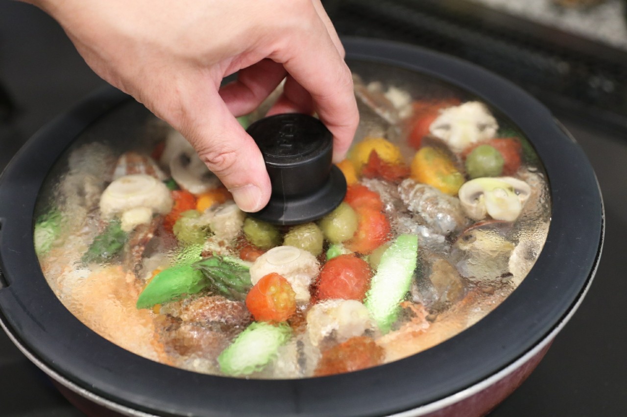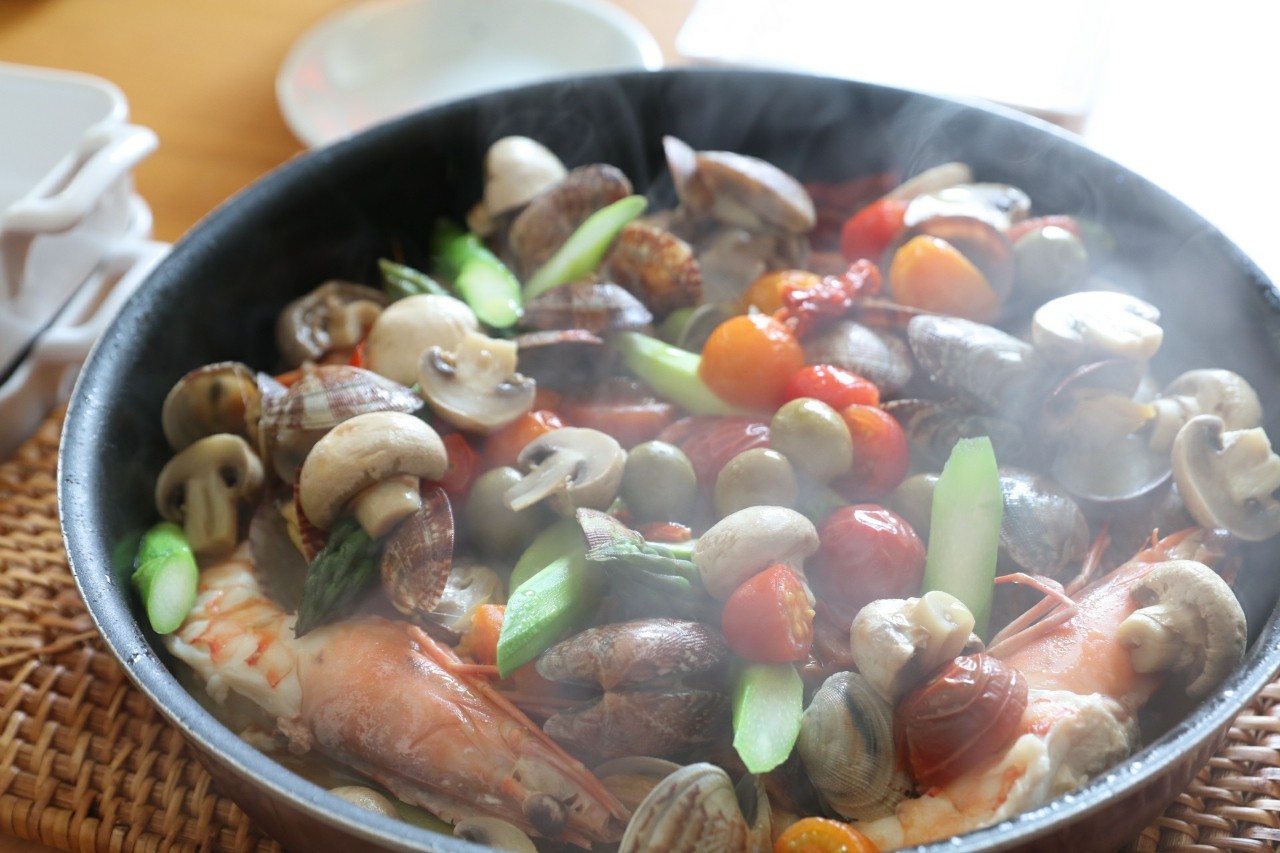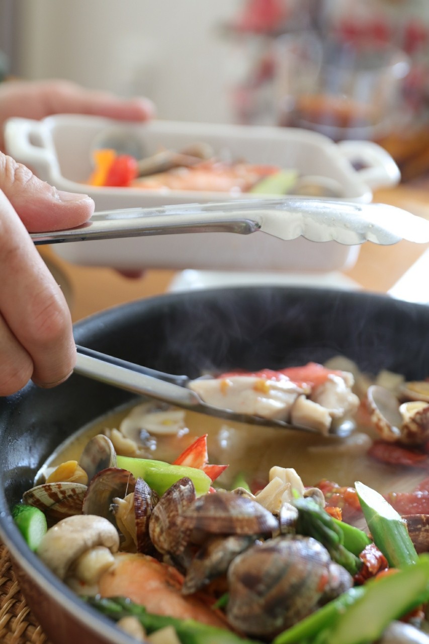 今回のアクアパッツァは、食べやすようにお魚は、切り身の金目鯛、帆立、海老もあらかじめ殻はとって。