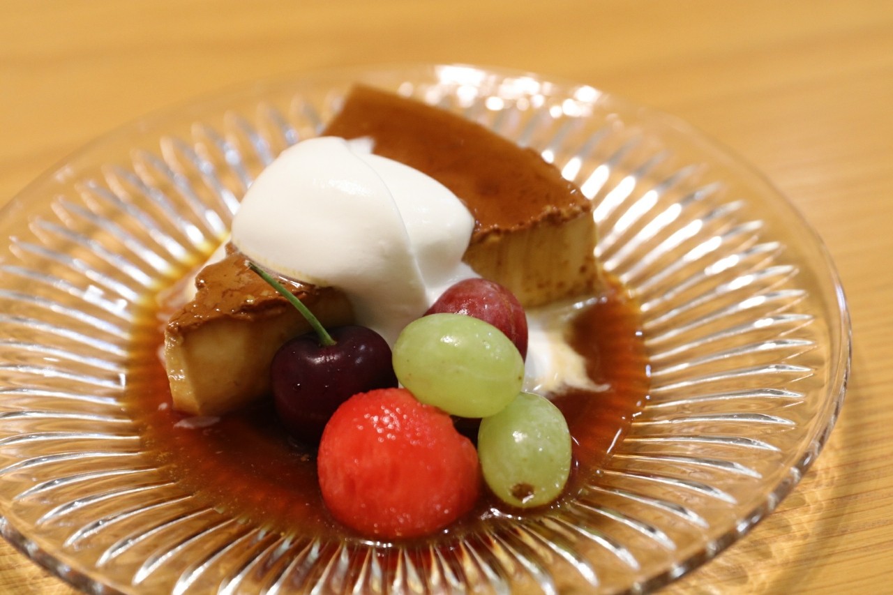カスタードプリンのほろ苦さと生クリームが絶妙。