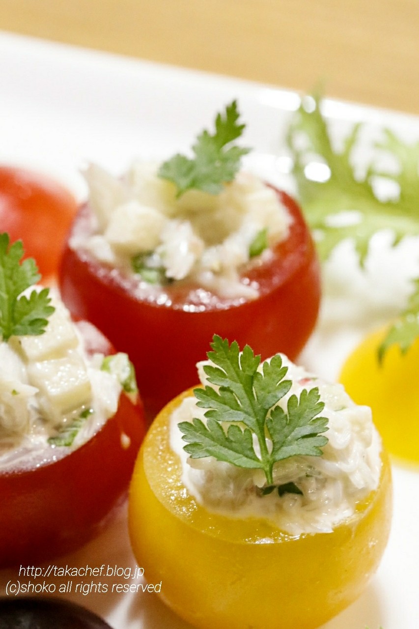 ミニトマトの中にリンゴと蟹のサラダをつめました。
