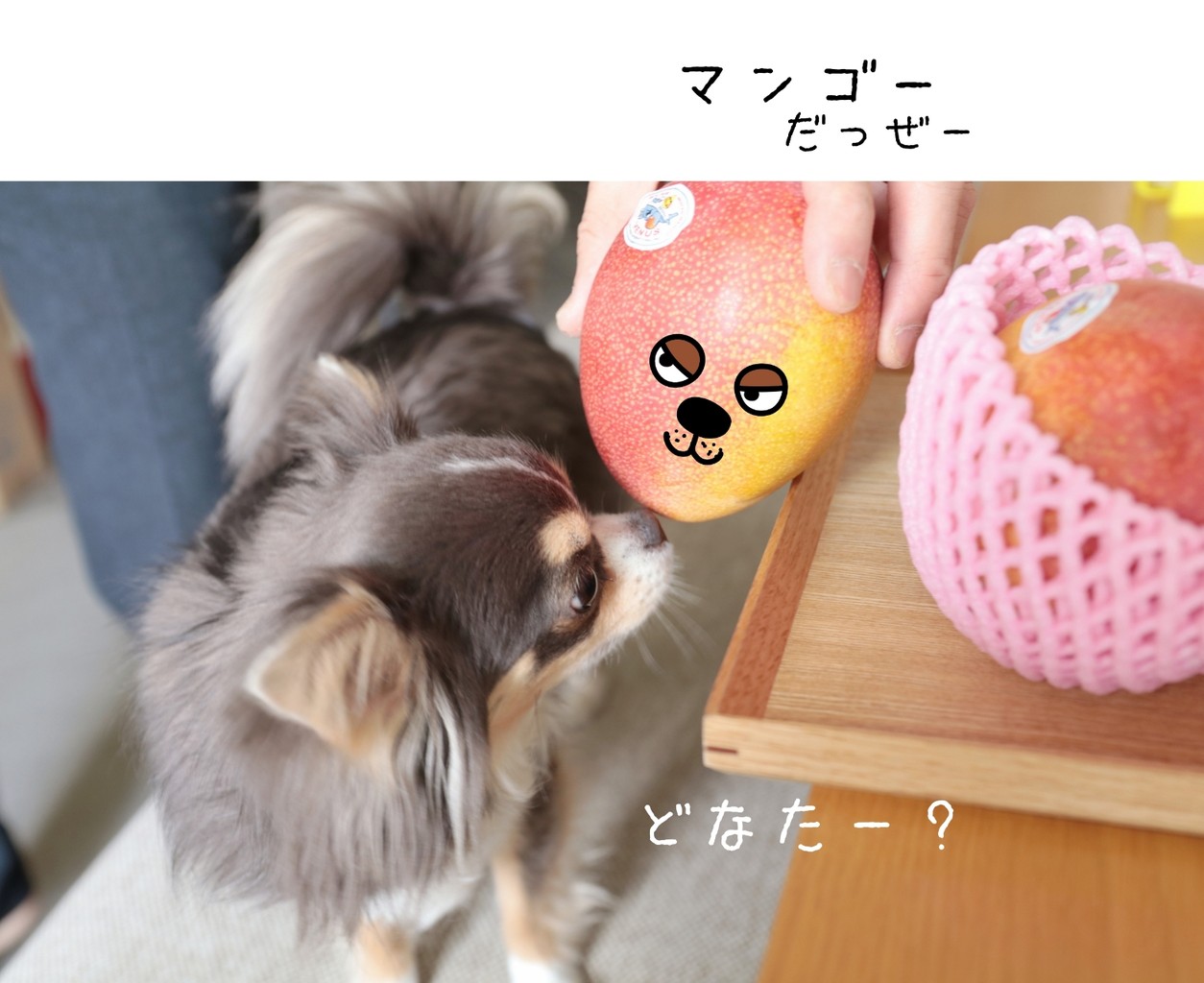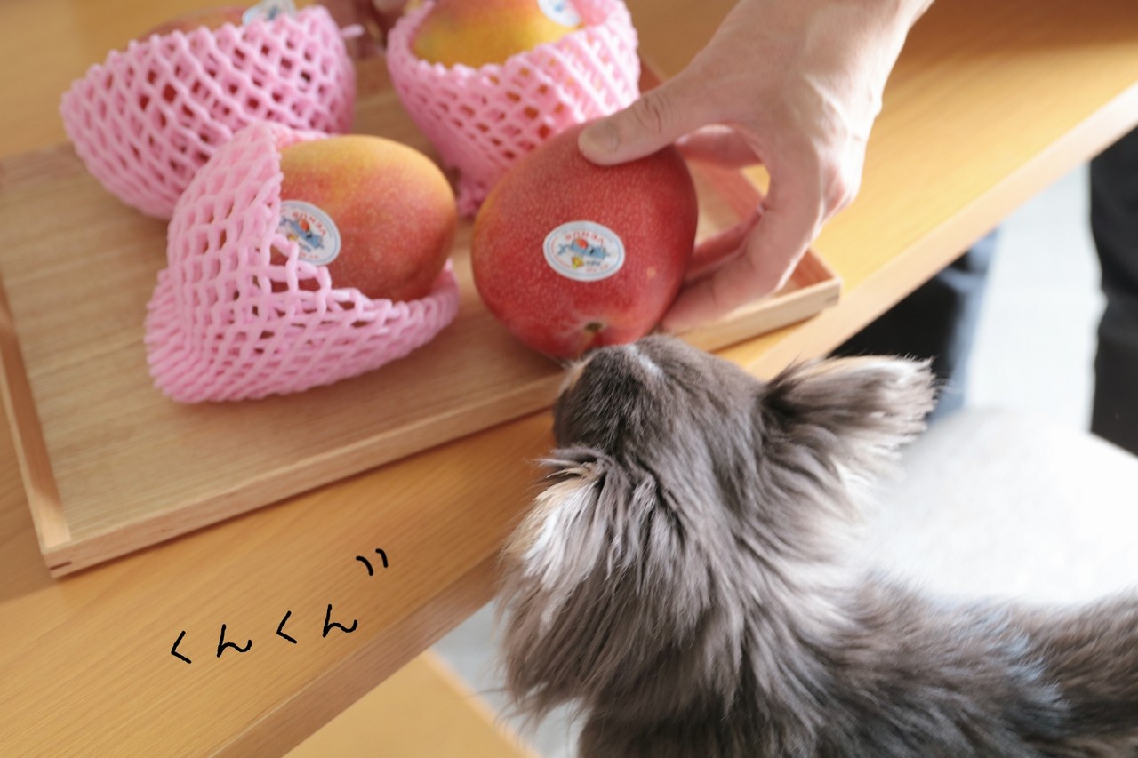 マンゴーが届いて、飼い主、わくわくしていたら、犬もいつもと違うおかしな様子を察し、
