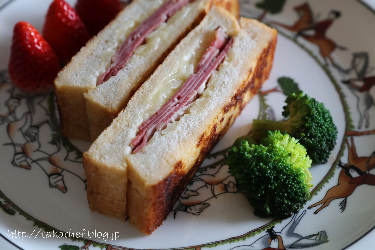 フレンチトーストのパン生地に、ビーフパストラミとチーズをはさんだもの。
