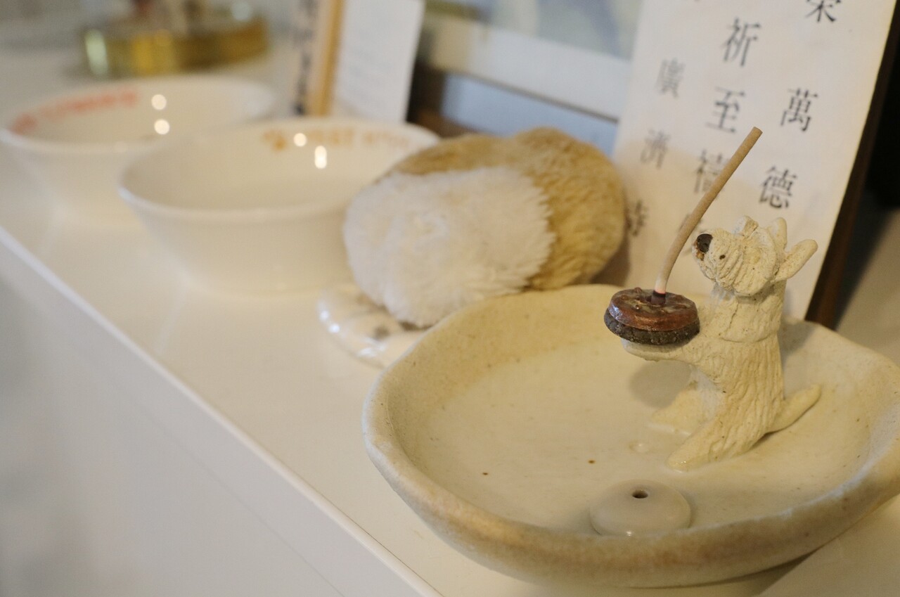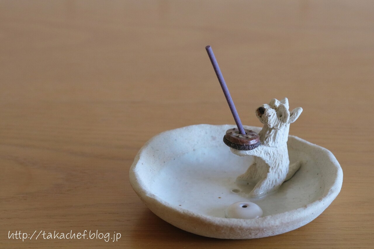 お線香立てはこれだよ。ブランカ君がなくなった時に、ブログの読者さんに教えてもらって買ったんだ。手作りらしく、焼き上げるまでの時間がかかったけれど、待ちに待って届いたときはうれしかったなぁ。