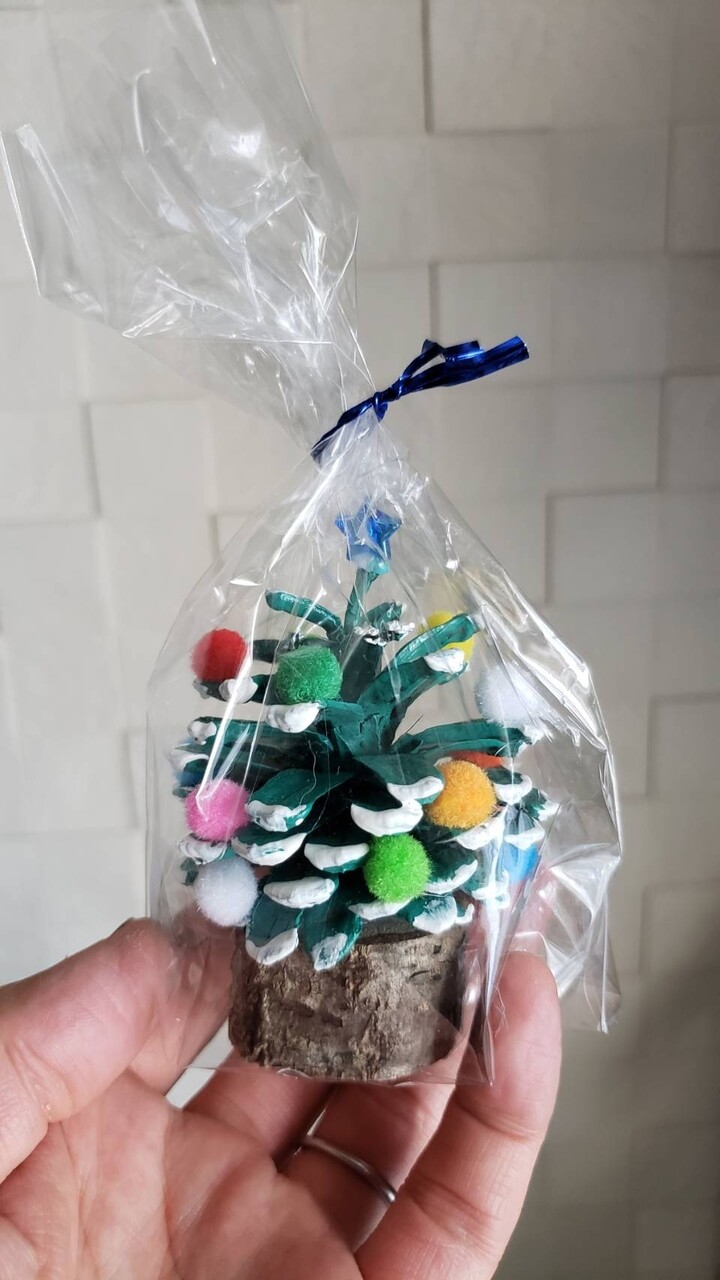 まつぼっくりひとつひとつに色ぬって、ボンボンなんてつけちゃって。