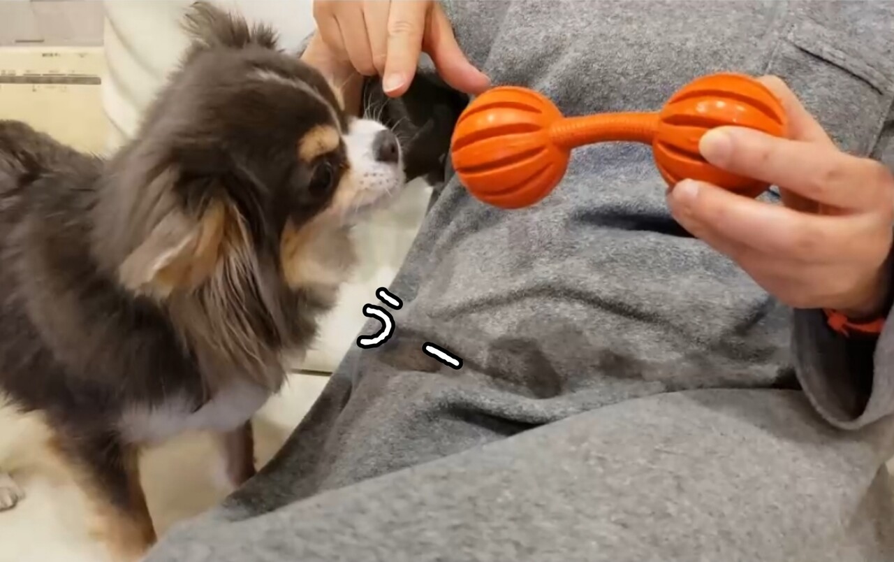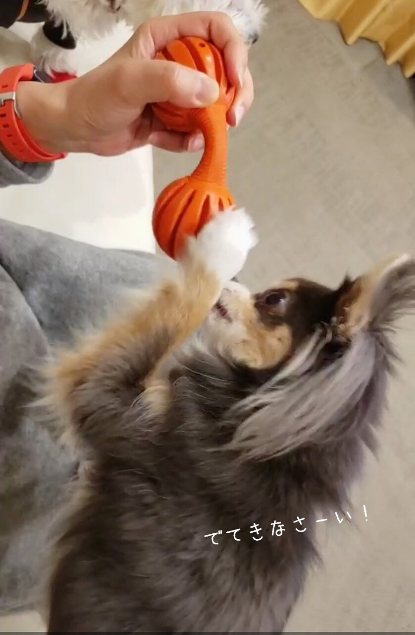 知育おもちゃには、カリカリドッグフードを入れてあげるのだが、