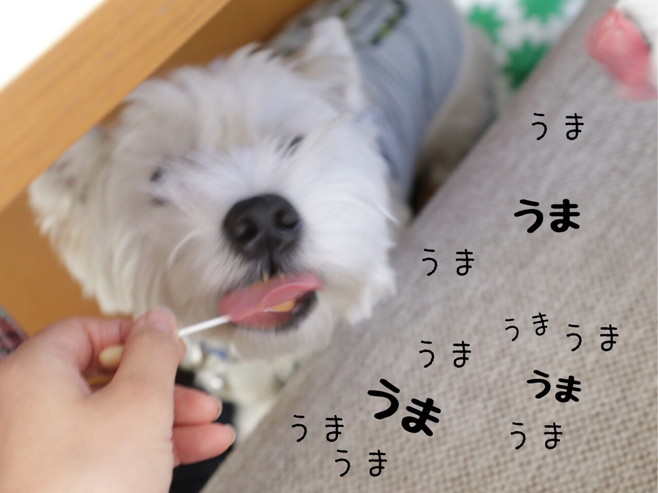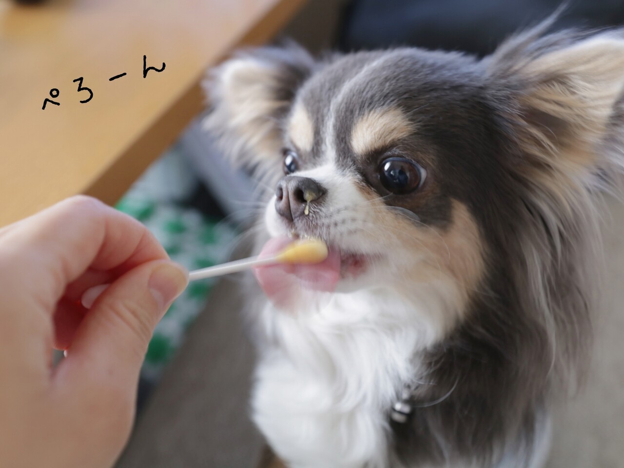綿棒につけてペロペロしてもらっている。