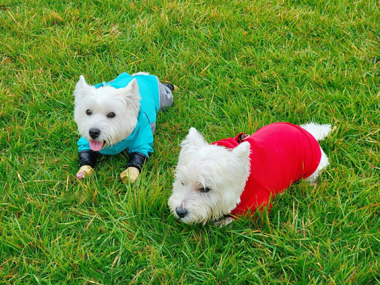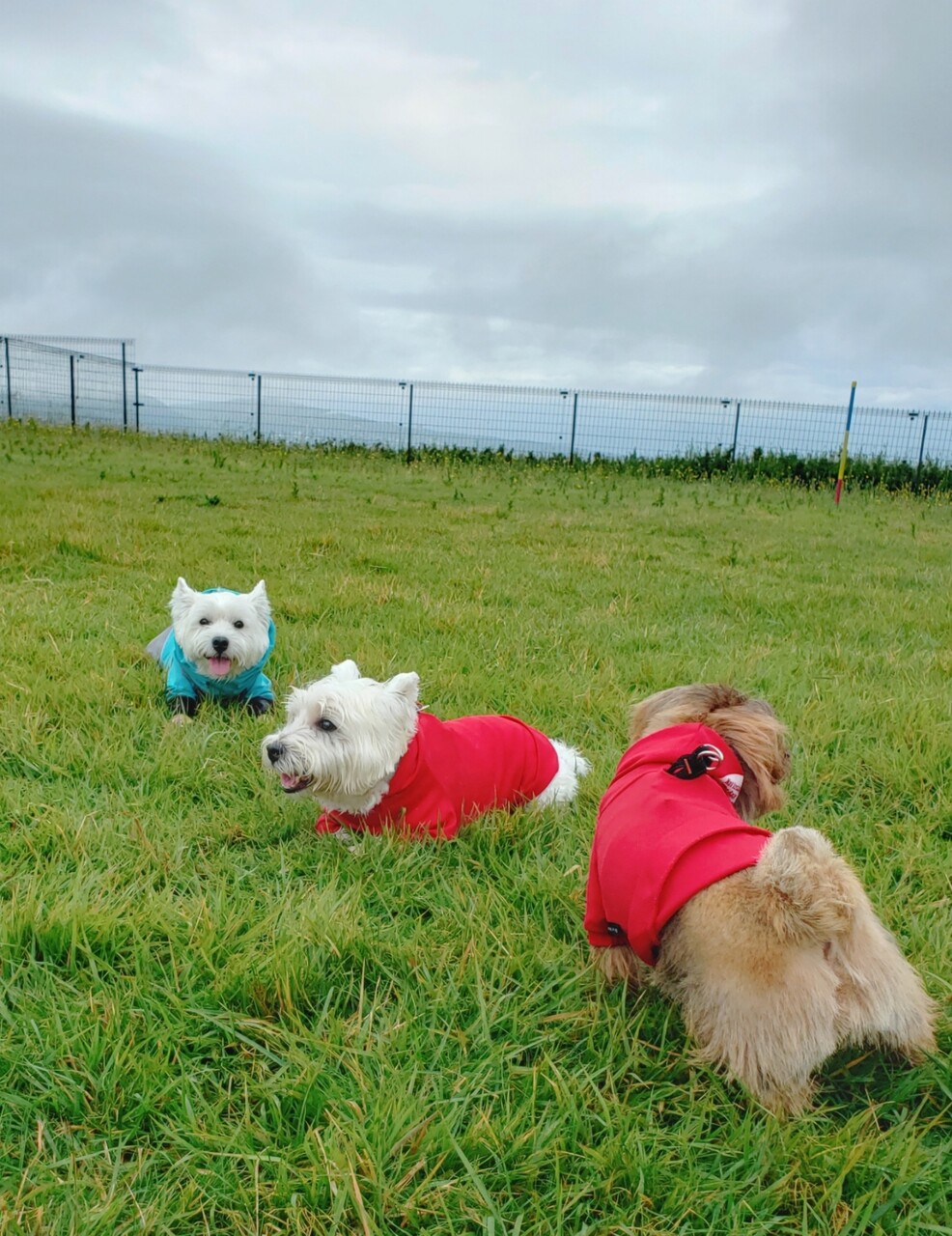 カッパは着ているものの、濡れたところにゴロンとするのはやめておくれ。と、飼い主は思ってしまうのだが、犬達はきにしてないようだ。