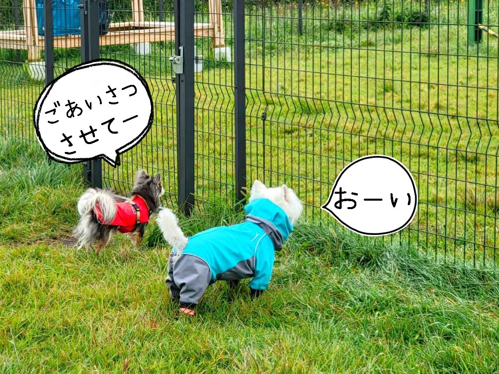 途中、お隣のドッグランにお友達がやってきた。