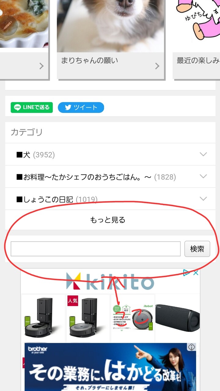 スマホだと、トップ画面を下にスクロールしていただいて、カテゴリーの下に『検索』っていうのがでてきます。