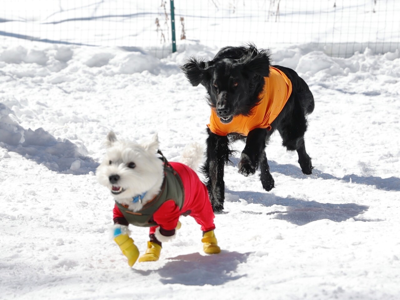 余裕の大型犬と、びびりの大きめ小型犬。
