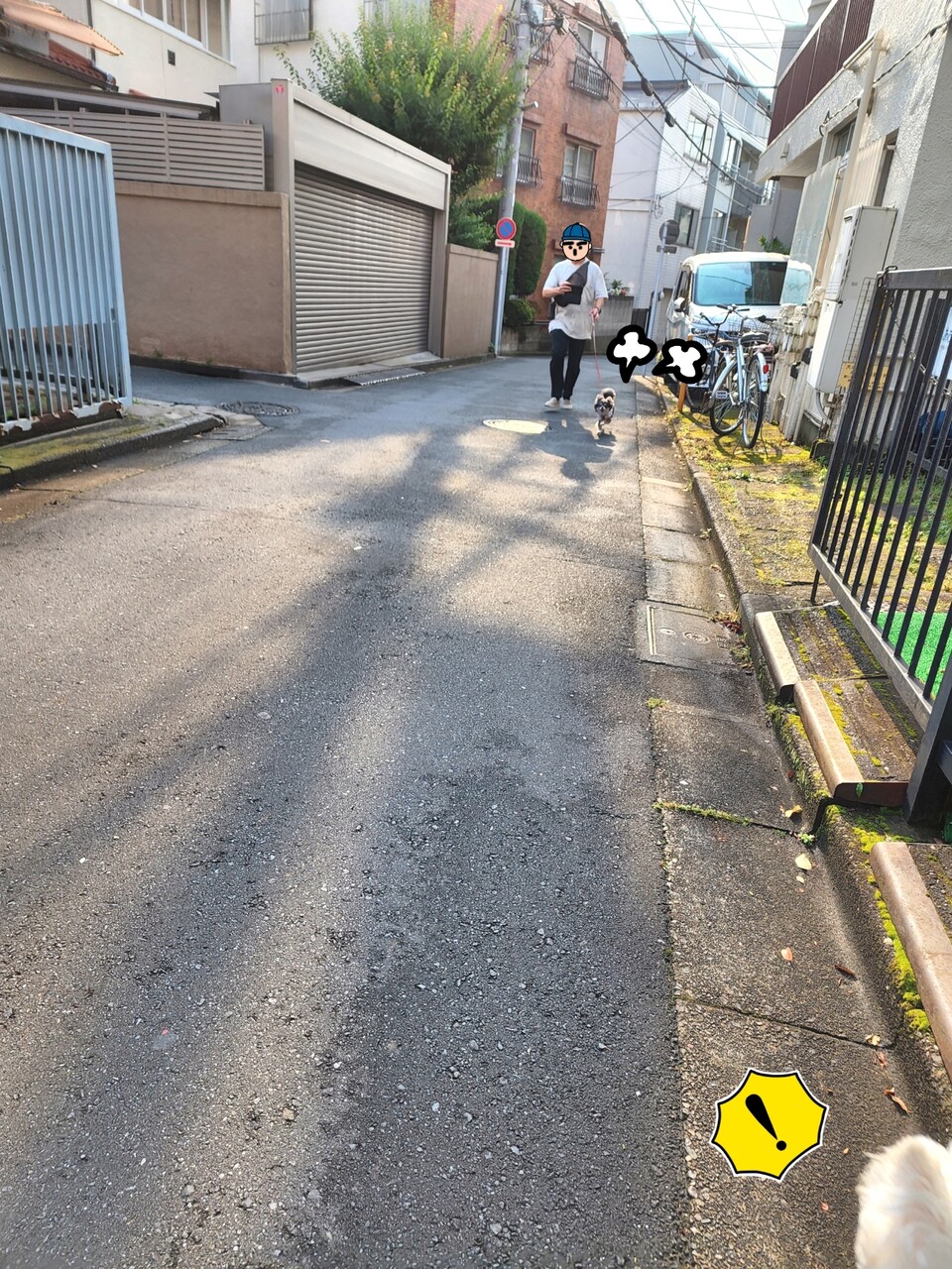 まりちゃんと、再会してからは、いつもの散歩を思ったのか、全電信柱をクンクンしようとしている。