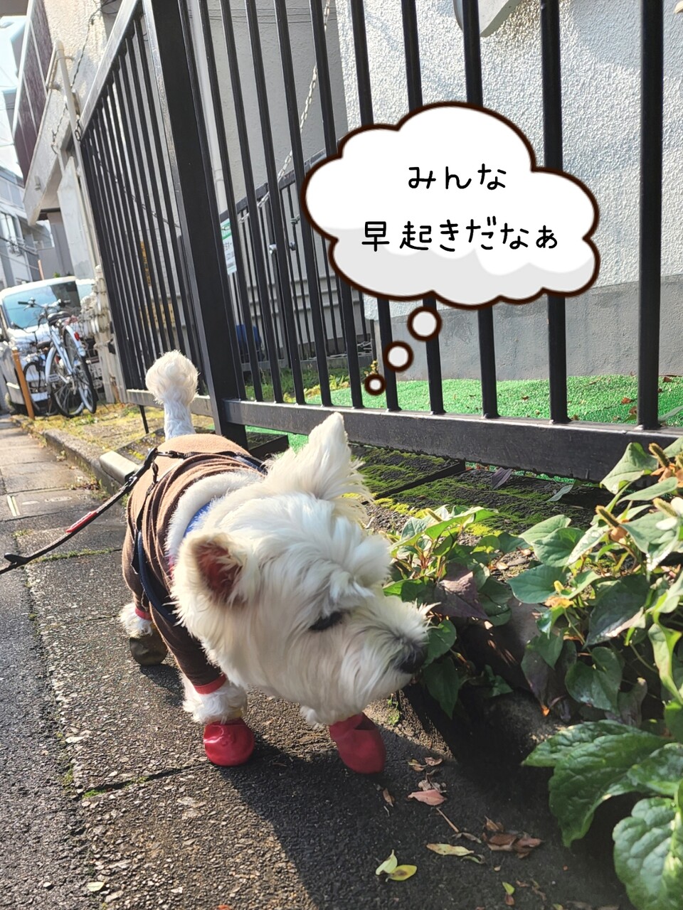 仕事の日の朝は、ちょこっとしかお散歩に行かれないのを、ゆきちも、重々承知でございまして、協力してくれる。普通のお散歩では、全電信柱や、全植物たちを“くんくん”するところを、仕事の前は、選りすぐりの電信柱と、植物だけにしてくれて、ひたすら走るんだ。