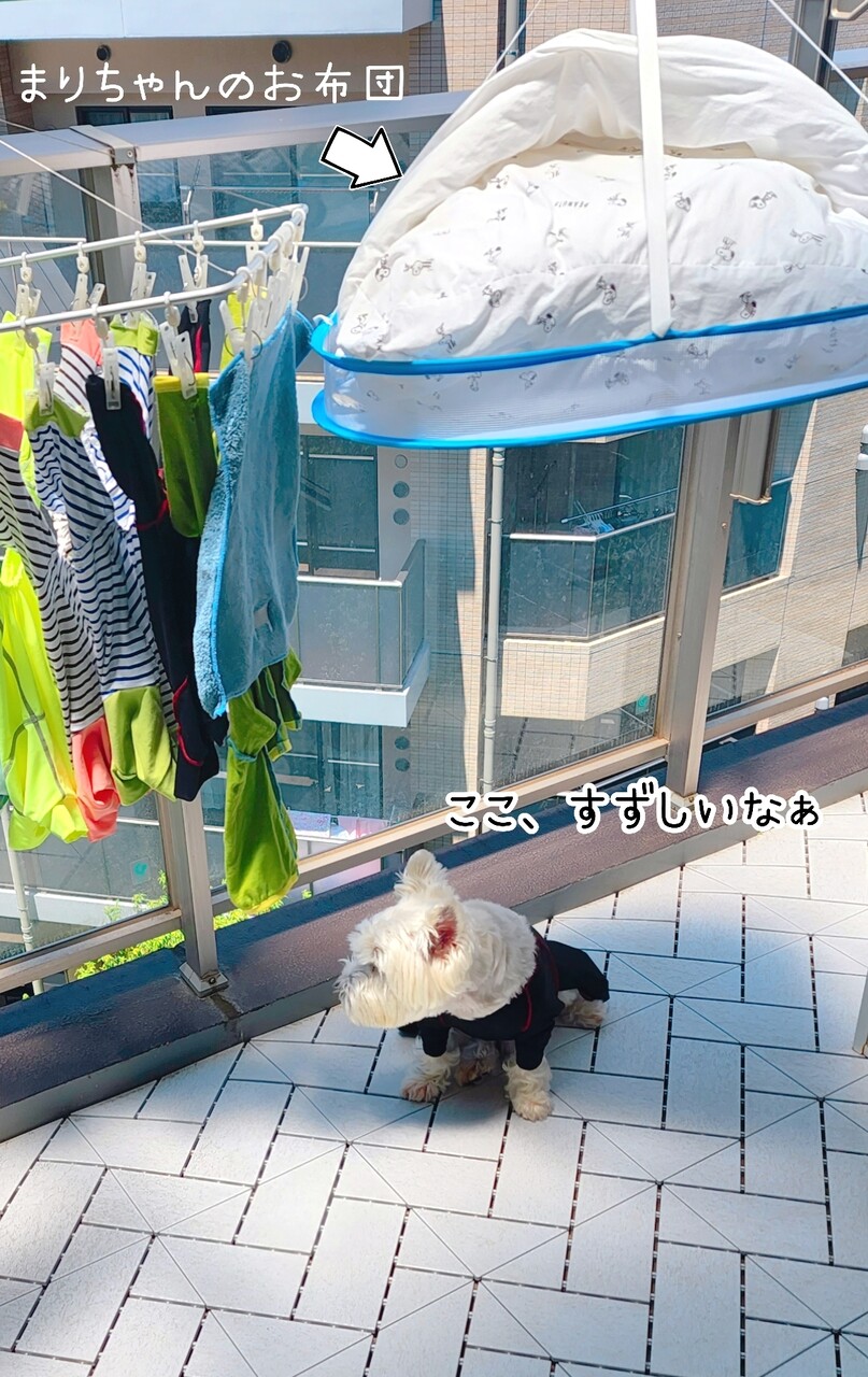 まりちゃん、昨日、あらってあげたお布団がふかふかに乾いて~