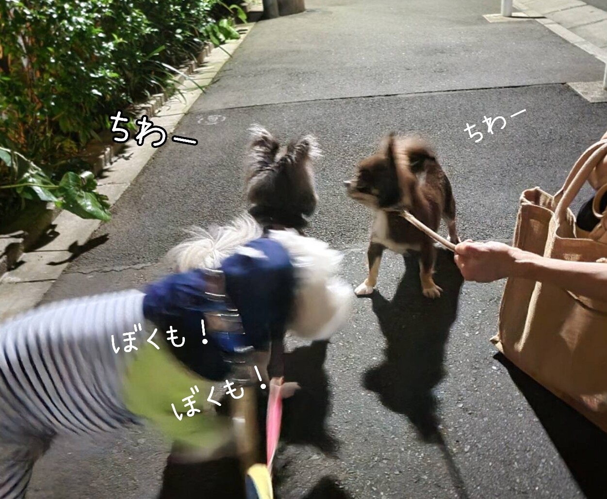 夏は、お散歩できる時間が限られるから、お友達にもいっぱいあうよ。真夜中なのに