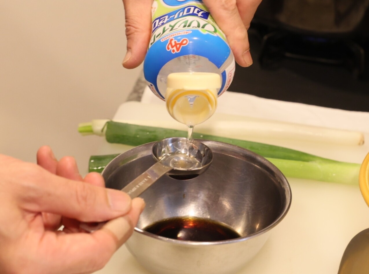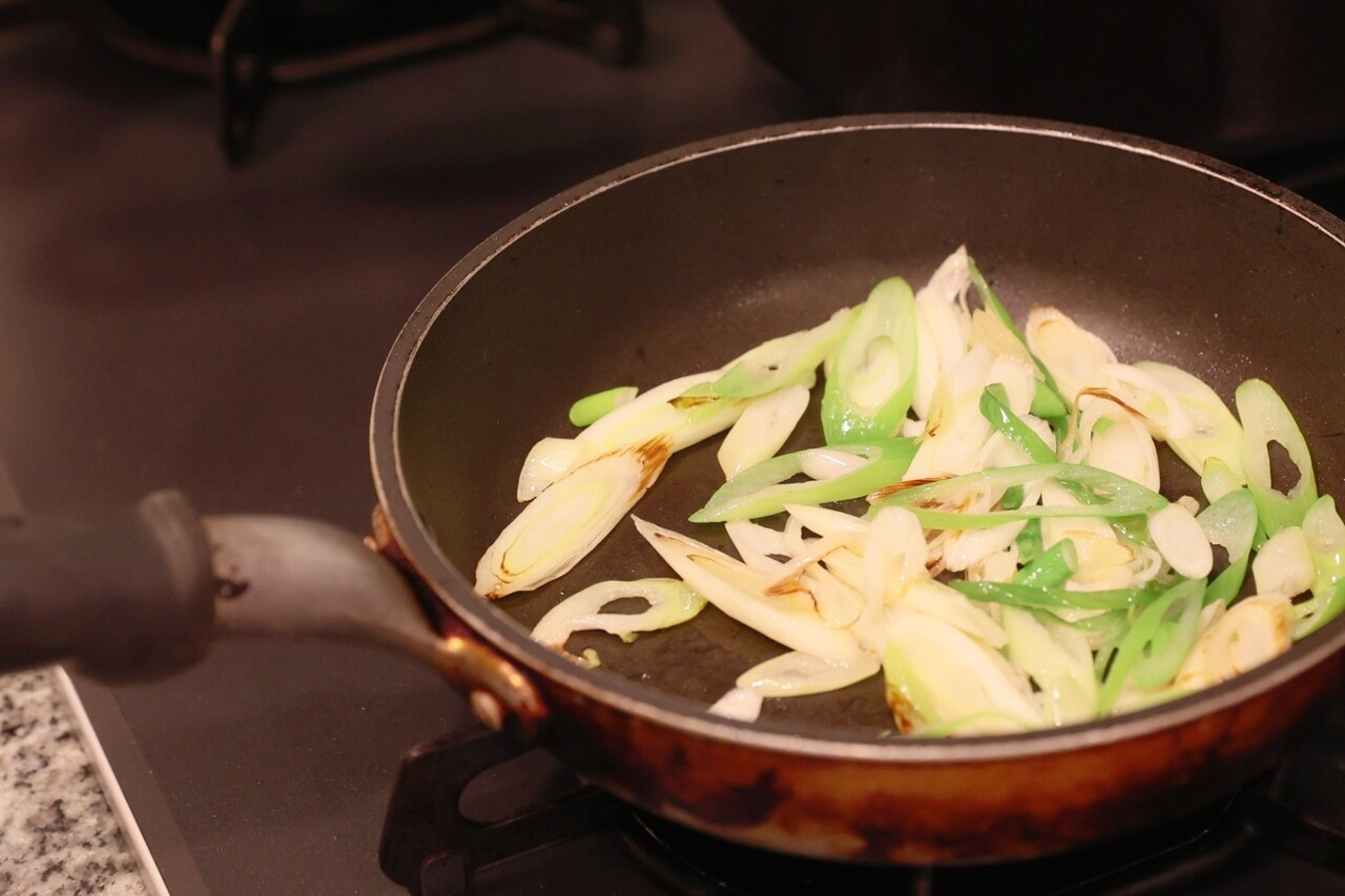 ネギも、鶏肉をゆでたお鍋をゆで汁を捨てて使う事になっているのに、小さなフライパンだしちゃってる(笑) レシピは、“しんなりするまで、2分炒める。”と書いてあったらしいが、
