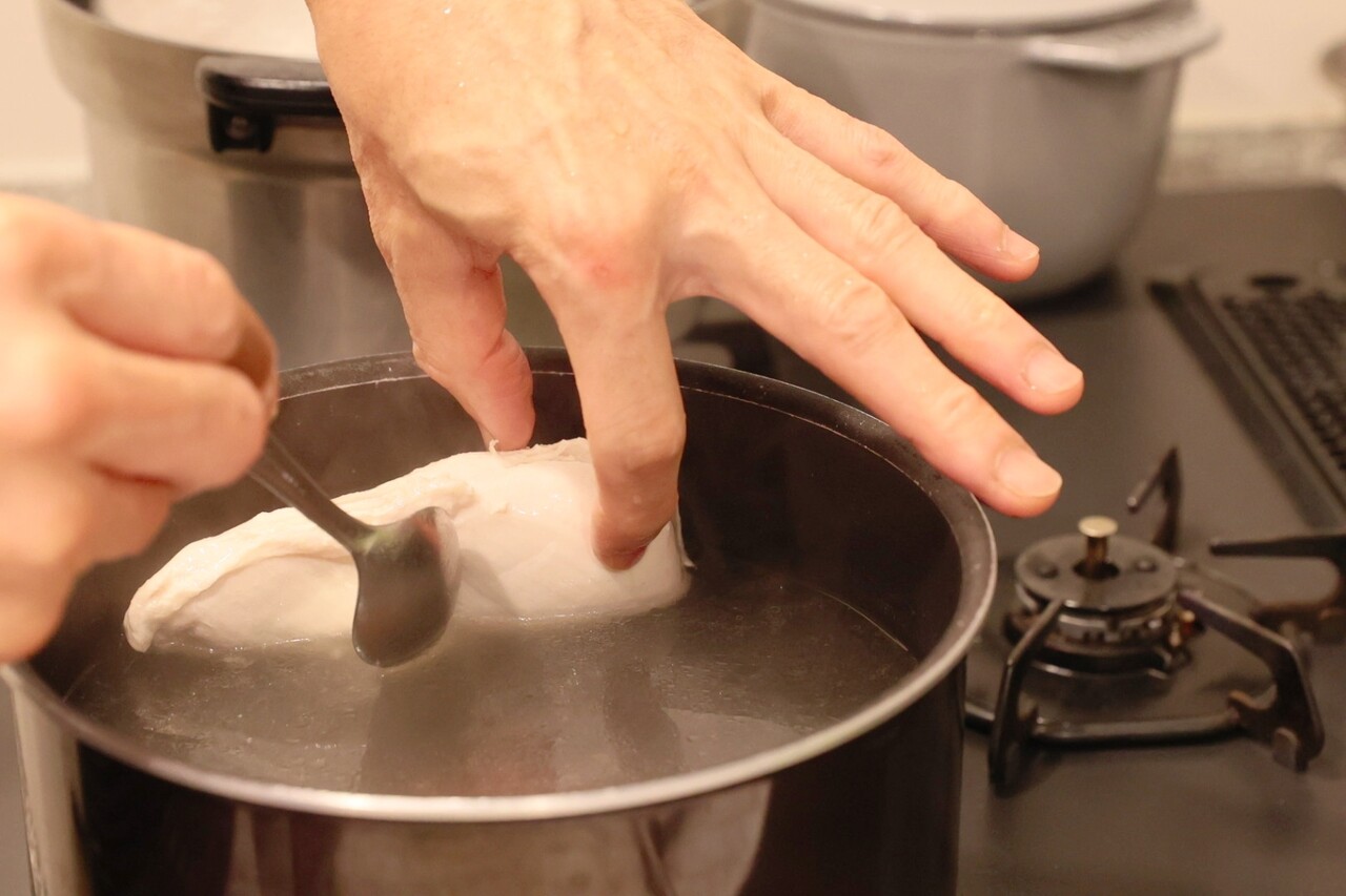 鶏肉の茹で具合は、ご自分の手の感覚で確認してた(笑)