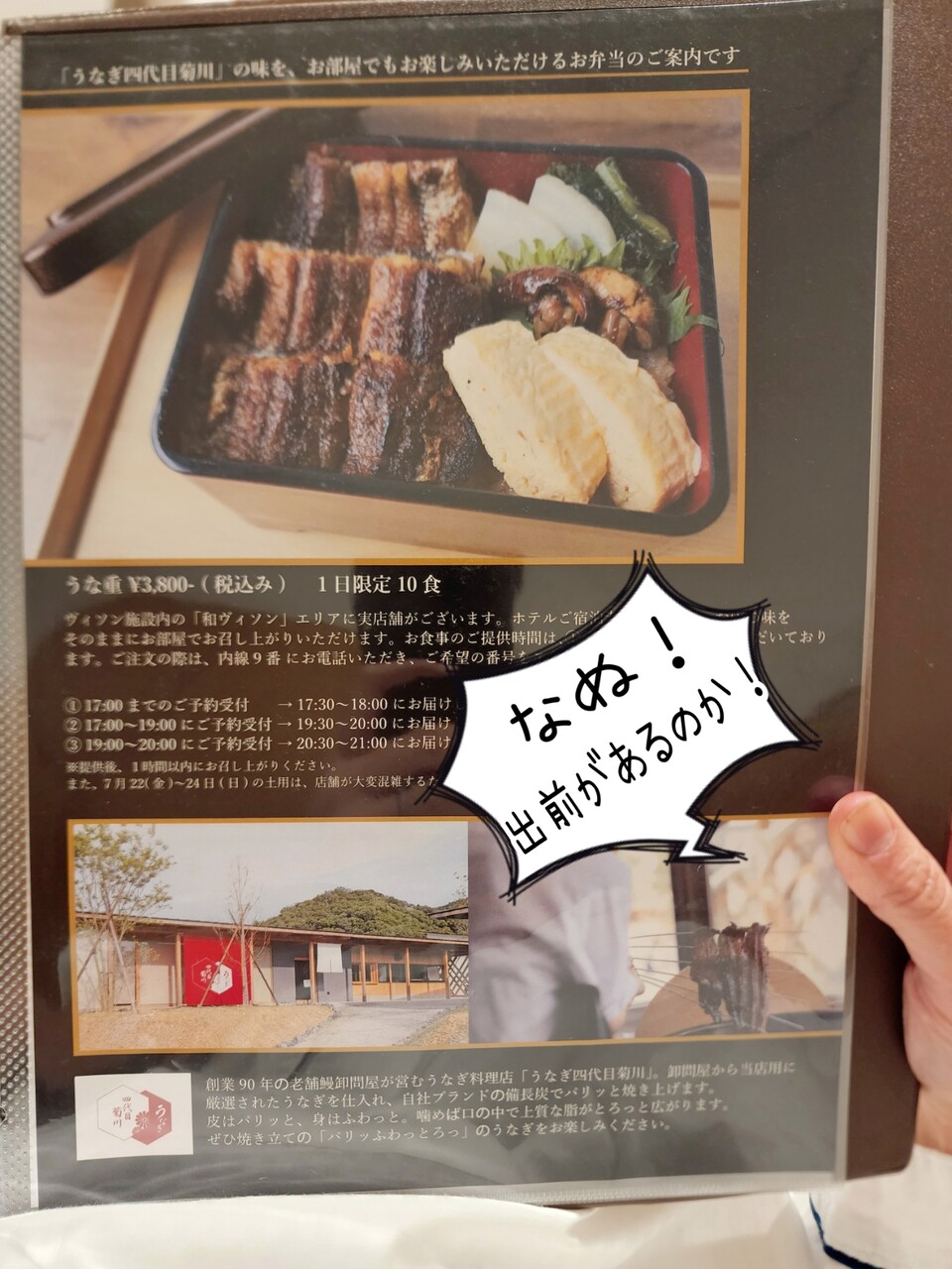 この鰻なのですが、私は、買いに行ってテイクアウトしたのですが、お部屋にも届けてくれるらしい。