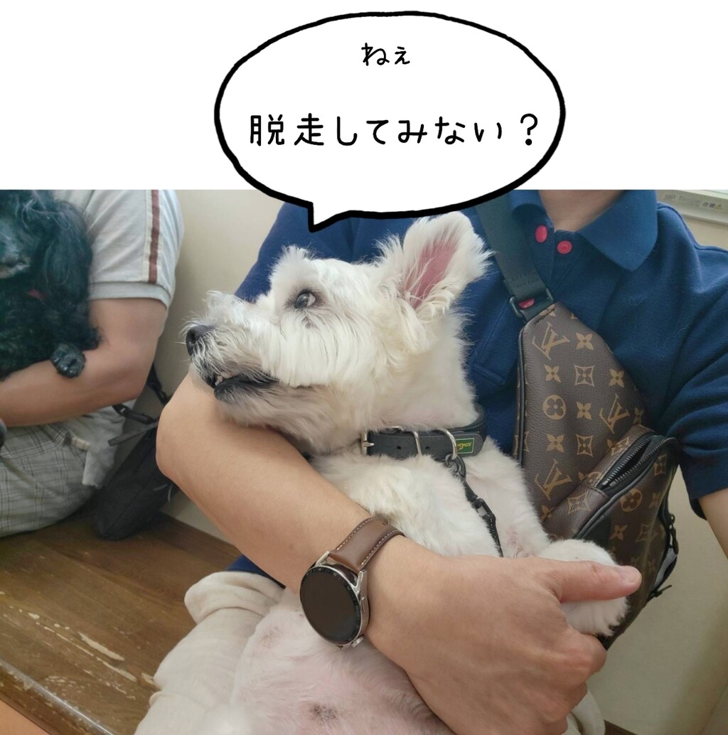 (※待合室にて 他のワンコが気になる。余裕だねぇ)