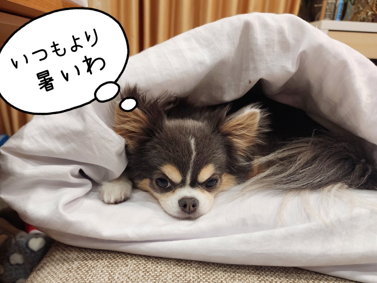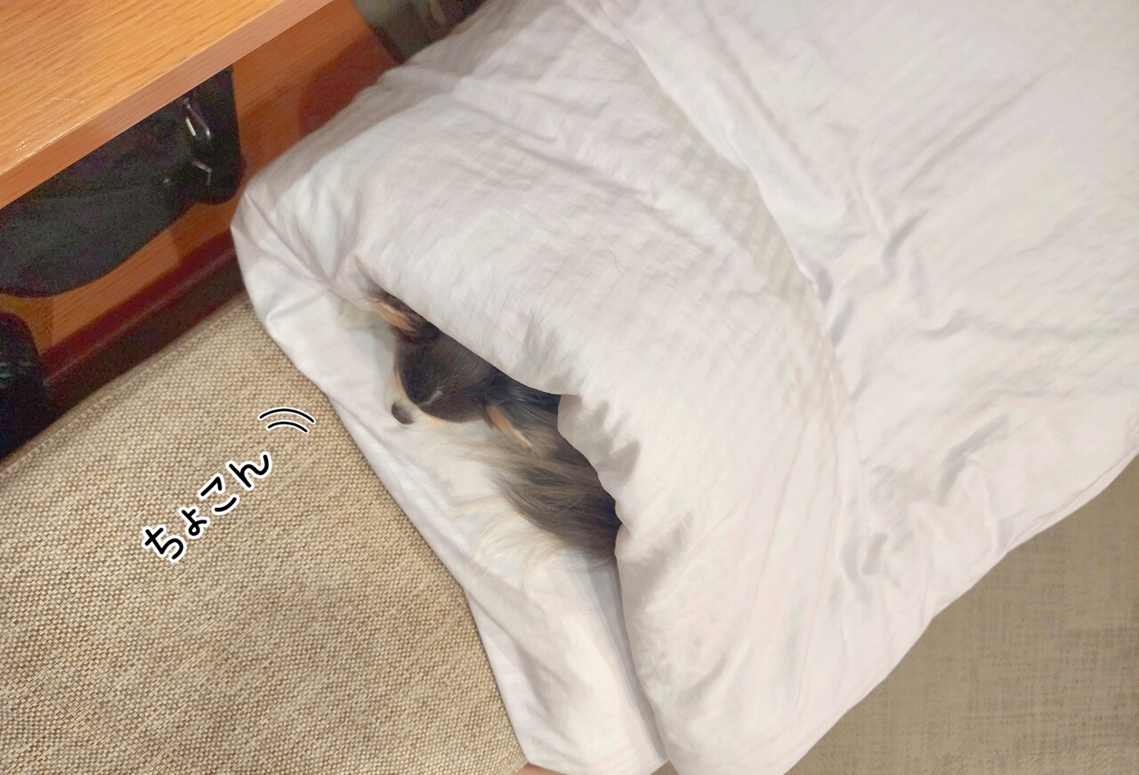 飼い主は、早く布団を定位置に戻せばいいのに、これを繰り返すまりちゃんが、おもしろくて、