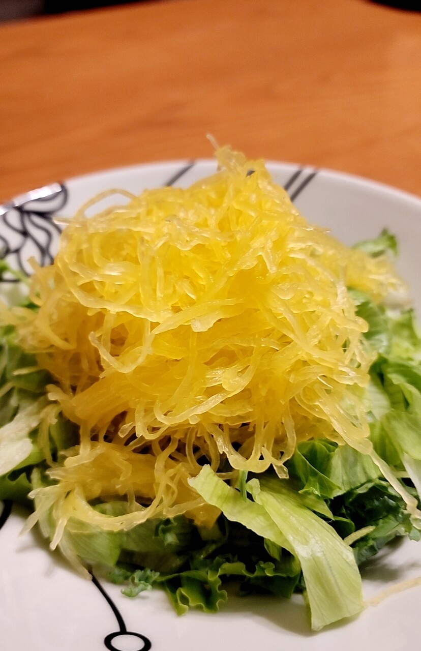 素麺南瓜は、バターナッツみたいな風貌で、ゆでるとこうして素麺みたいに細くポロポロととれる面白お野菜
