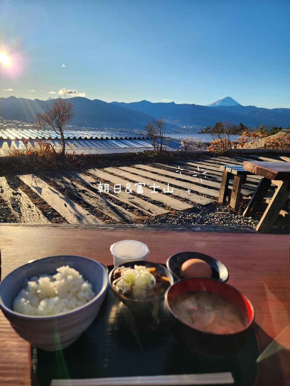 朝日と富士山とに見守られながらの朝ごはん