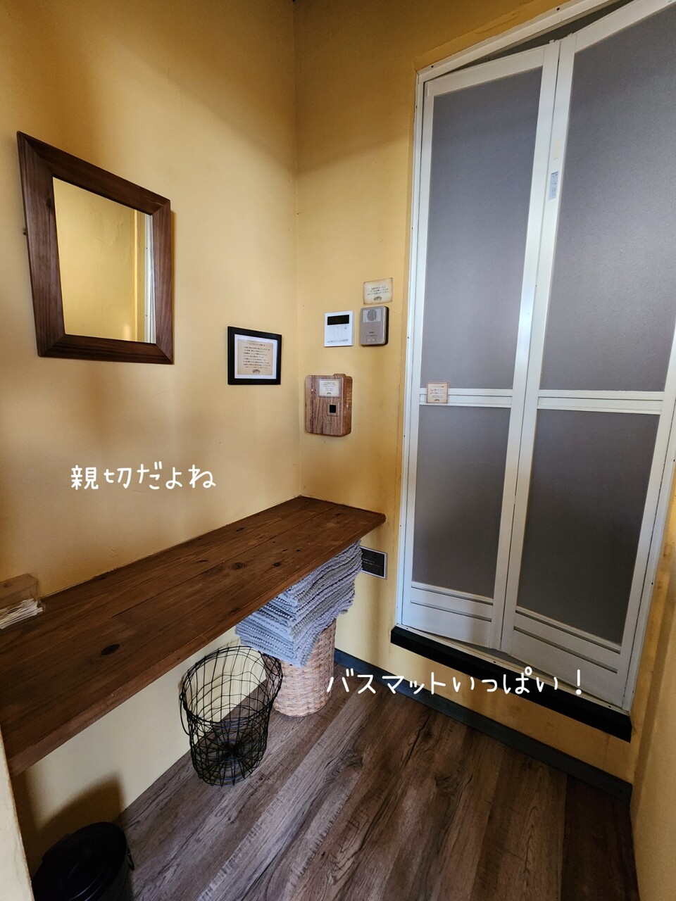 シャワー室もちょこっと覗いたけれど、バスマットもいっぱい用意されていた。